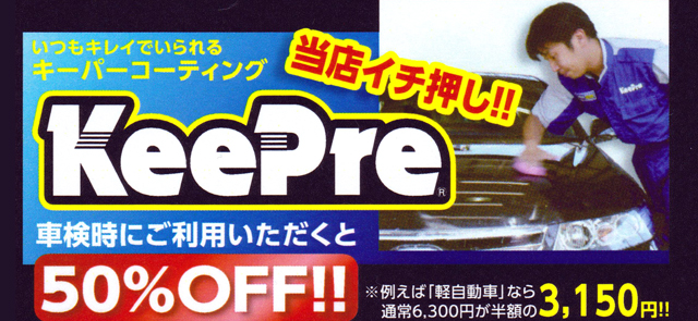 車検時にキーパーコーティングをご利用いただくと、お得な50%OFF!
